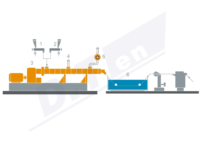合金塑料工藝 1. 聚合物A 2. 聚合物B 3. 雙螺桿擠出機(jī) 4. 自然排氣 5. 強(qiáng)制真空排氣 6. 拉條切粒 |