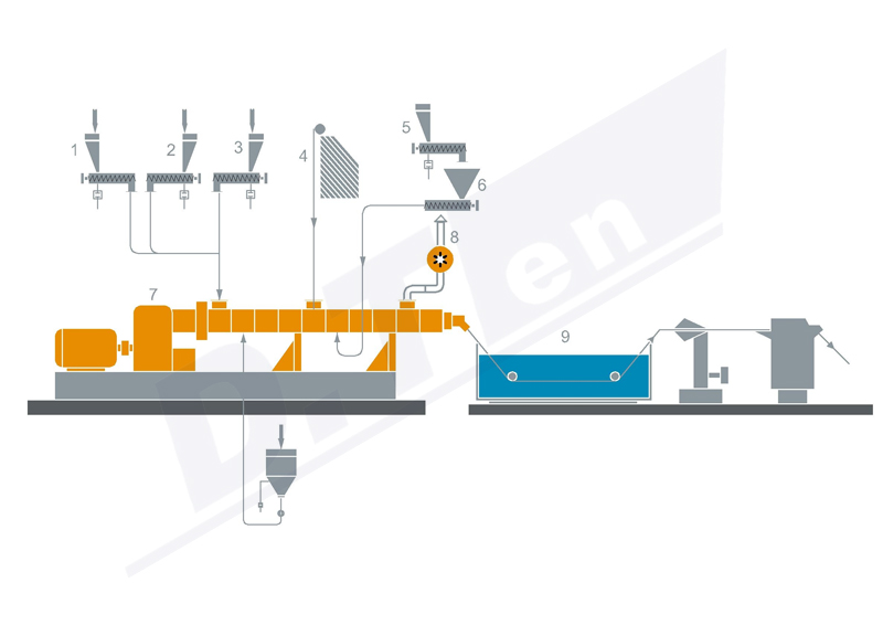 改性工藝 1. 聚合物 2. 填充 3. 助劑 4. 長玻纖 5. 短玻纖 6. 側(cè)向喂料機(jī) 7. 雙螺桿擠出機(jī) 8. 強(qiáng)制真空排氣 9. 拉條切粒 |