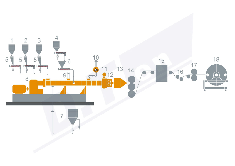 1. 聚合物 2. 助劑 3. 填充1 4. 填充2(可選) 5. 失重式喂料機(jī) 6. 側(cè)向式喂料機(jī) 7. 液體喂料機(jī)(可選) 8. 雙螺桿擠出機(jī) 9. 自然排氣 10. 強(qiáng)制真空排氣 11. 開(kāi)車閥 12. 熔體泵 13. 擠出模頭 14. 三輥壓延 15. 測(cè)厚裝置 16. 裁邊裝置 17. 牽引裝置 18. 收卷裝置 |